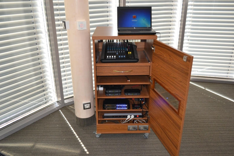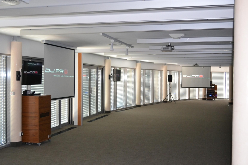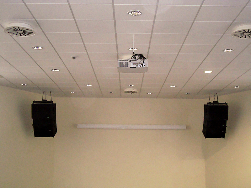Nagłośnienie przestrzenne PA sali konferencyjnej oraz system multimedialny sterowany centralnie z pulpitu.