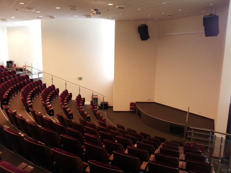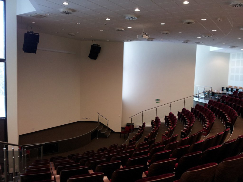 Nagłośnienie sali audytoryjnej 163 m2 o mocy łącznej 4800W RMS. Nagłośnienie wyrównane liniowo line-array podwieszone w dwóch gronach oraz system sterowania dźwiękiem.