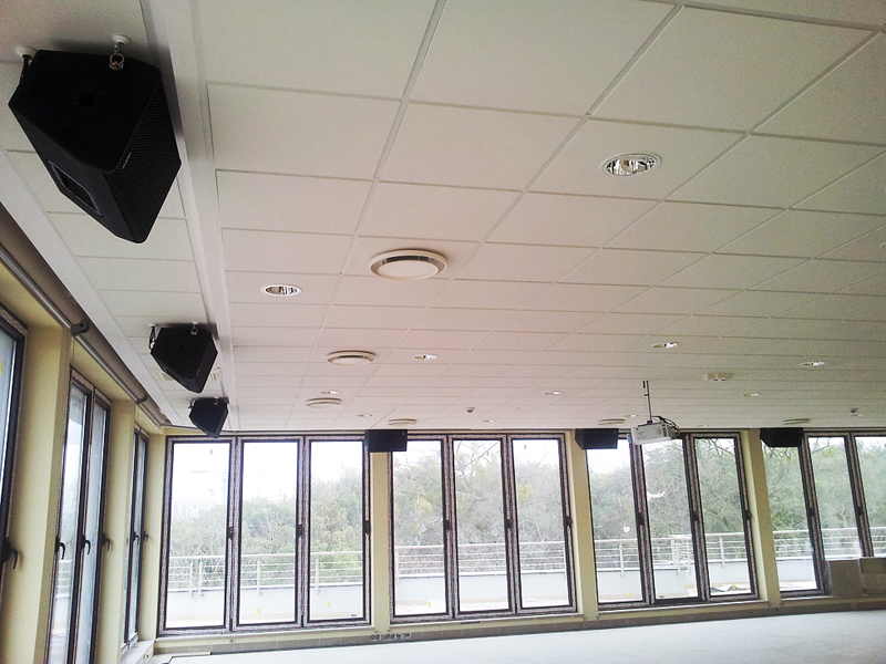 System nagłośnienia sali wielofunkcyjnej - 123 m2 o mocy łącznej 1800W RMS. Zestawy głośnikowe zawieszone pod sufitem.