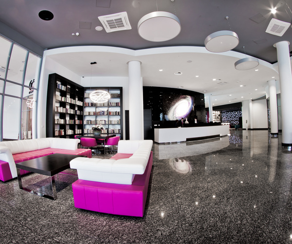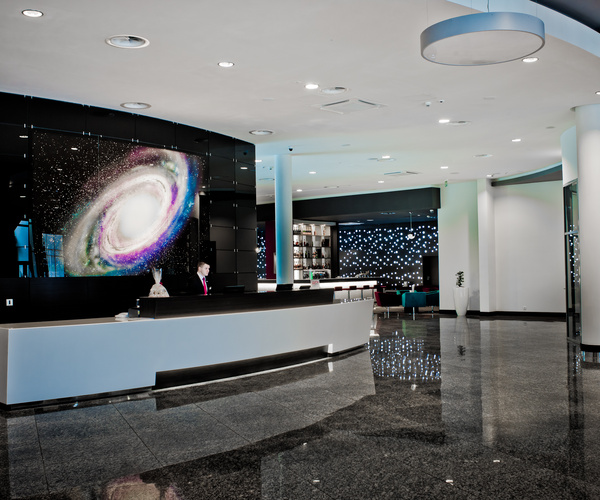 Nagłośnienie przestrzenne PA hotelu sterowane centralnie z podziałem na 5 niezależnych stref oraz system sterowania dźwiękiem niezależnie w 6 salach konferencyjnych z możliwością dowolnego łączenia sal.